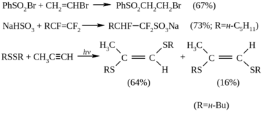 Аналогично присоединяются тиокислоты RCOSH, сульфонил- и сульфурилгалогениды, дисульфиды, бисульфиты и другие соединения: