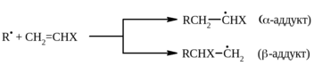 В случае несимметричных алкенов могут образовываться два радикал-аддукта: α-аддукт и β-аддукт: