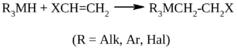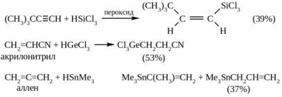 С помощью реакций радикального присоединения получают разнообразные элементорганические соединения. Гидриды органосиланов, органостаннанов и органогерманов присоединяются по радикально-цепному механизму по следующей схеме: