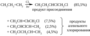Молекулярные галогены F2, Cl2 и Br2 также способны присоединяться к алкенам по цепному механизму. Если алкен содержит алкильные заместители, то атомы галогенов легко отрывают атомы водорода из аллильных положений (гл 5, ч.1). Например, хлорирование бутена-1 дает следующие продукты:
