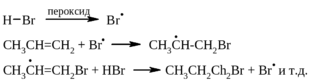Присоединение HBr к пропену, инициируемое УФ-светом или пероксидами, происходит против правила Марковникова (гл. 5, ч.1):