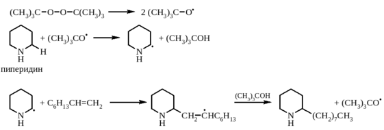 Реакция присоединения оказалась особенно полезной для алкилирования насыщенных гетероциклов с использованием алкенов-1. При действии трет-бутокси-радикалов, образующихся из ди-трет-бутилпероксида, сначала происходит отрыв водорода от атома углерода, соседнего с гетероатомом. Таким образом, алкилирование обычно происходит в α-положение: