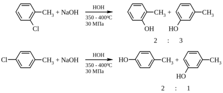 Механизм с промежуточным образованием дегидробензола реализуется при замещении галогена в арилгалогенидах, не содержащих электроноакцепторных групп, активирующих нуклеофильное замещение. При замещении хлора в орто-хлортолуоле на гидроксильную группу при нагревании с 15%-м водным раствором щелочи при 350 – 400ºС под давлением образуется смесь орто- и мета-крезолов в соотношении 2 : 3. В тех же условиях из пара-хлортолуола образуется смесь мета- и пара-крезолов: