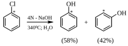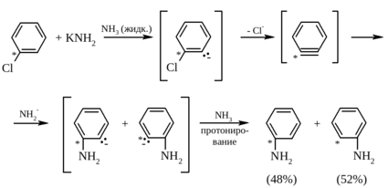 В 1953 г. Дж. Робертс привел убедительное доказательство образования дегидробензола как промежуточного продукта в реакции хлорбензола с амидом калия в жидком аммиаке. Хлорбензол, меченый в положении 1 радиоактивным изотопом 14C, образует почти равные количества анилина-1-14C и анилин-2-14C: