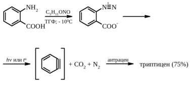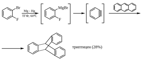 При использовании в качестве диеновой ловушки дегидробензола антрацена образуется своеобразный углеводород, называемый триптиценом: