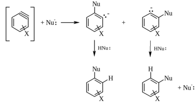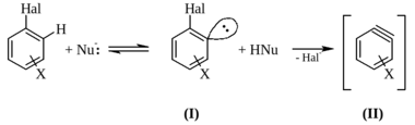 Неактивированные арилгалогениды, в которых хоты бы одно из двух орто-положений по отношению к атому галогена не занято заместителем, с сильными нуклеофилами реагируют по механизму, включающему последовательные стадии отщепления и присоединения. Нуклеофил Nu:- на первой стадии действует как основание, отщепляя протон в орто-положении к атому галогена ароматического субстрата. Отщепляется именно орто-протон, поскольку в арилгалогенидах орто-протон самый «кислый» (кислотность убывает в ряду орто-H > мета-H > пара-H). Образовавшийся карбанион (I) быстро выбрасывает анион Hal-, в результате чего образуется незаряженная очень нестабильная частица, которую можно представить в виде бензольного кольца с тройной связью (II). На этом заканчивается стадия отщепления: