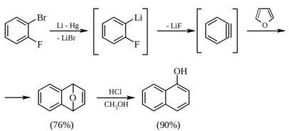 Одно из доказательств, представленных впоследствии Виттигом (1956) в пользу существования дегидробензола, основывалось на улавливании этого крайне нестабильного интермедиата как диенофила с помощью диенов в реакции Дильса-Альдера. Так, при встряхивании раствора орто-фторбромбензола в фуране с амальгамой лития был получен 1,4-дигидронафталин-1,4-эндооксид, который при кислотном гидролизе превращается в 1-нафтол: