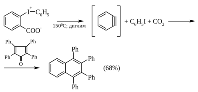 Серди других нейтральных уходящих групп наиболее эффективным оказывается йодбензол. Например, при термическом разложении 2-карбоксифенилйодония в присутствии тетрафенилциклопентадиенона как реакционноспособного диена образуется тетрафенилнафталин с выходом 68%: