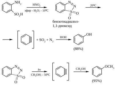 Это один из лучших и наиболее простых методов генерации дегидробензола, поскольку выход продукта захвата различных диенов обычно превышает 75%. Аналогичным способом дегидробензол может быть генерирован и при диазотировании орто-аминобензолсульфиновой кислоты, в качестве промежуточного соединения при этом образуется бензотиадиазол-1,1-диоксид, который при термическом разложении или фотолизе расщепляется с образованием дегидробензола:
