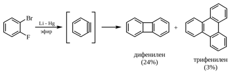 При отсутствии нуклеофильных агентов или других «ловушек» дегидробензол превращается в димер (дифенилен) и тример (трифенилен):