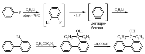 Образование смесей изомерных фенолов или аминов означает, что во всех этих реакциях первоначально образуется нестабильный интермедиат, а именно, арин, который затем присоединяет нуклеофильный агент OH- или NH2- с низкой региоселективностью Такое предположение было впервые высказано в 1942 г. Г. Виттигом, который изучал реакцию фениллития с фтор-, хлор-, бром- и йодбензолом в эфире, где неожиданно оказалось, что скорость образования 2-литийбифенила уменьшается в ряду C6H5F >> C6H5Cl > C5H5Br ~ C6H5I. Для объяснения образования 2-литийбифенила и аномальной реакционной способности фенилгалогенидов Виттиг предложил следующую схему: