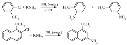 Аналогично при взаимодействии орто-хлортолуола с амидом калия в жидком аммиаке образуется смесь орто- и мета-толуидинов, а 1-метокси-2-хлорнафталин в тех же условиях дает 1-метокси-3-аминонафталин: