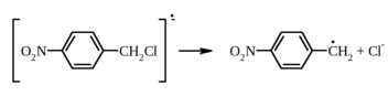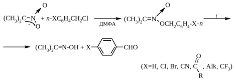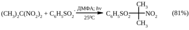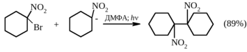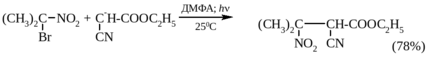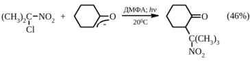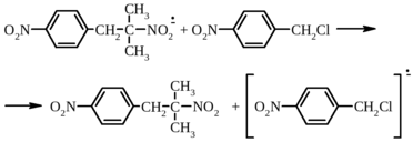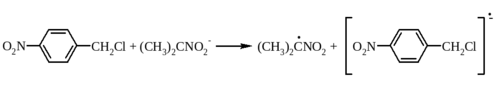 Однако пара-нитробензилхлорид в реакции с натриевой солью 2-нитропропана образует продукт C-алкилирования с выходом 92% и только 6% продукта O-алкилирования. Это определенно указывает на изменение механизма реакции. Действительно, акцепторы электронов ингибируют реакцию C-алкилирования, а доля продукта O-алкилирования при этом сильно возрастает. Так, в присутствии 0,2 эквивалента 1,4-динитробензола как акцептора электронов выход продукта C-алкилирования уменьшается с 92 до 6%, а выход продукта O-алкилирования возрастает с 6 до 88%. Это позволяет предположить, что O-алкилирование анионов нитроалканов действительно протекает как SN2-замещение у насыщенного атома углерода, тогда как для C-алкилирования реализуется альтернативный ион-радикальный цепной процесс, аналогичный SRN1-механизму для замещения в ароматическом ряду:
