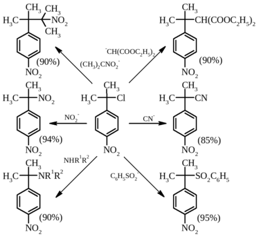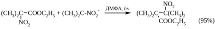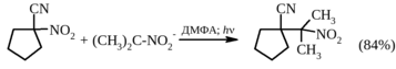 Все эти реакции проводились в ДМФА или ДМСО при УФ-облучении. Помимо пара-нитрокумилхлорида в такие реакции вступают и другие соединения с третичным атомом углерода: 4-(1-метил-1-нитроэтил)пиридин PyC(CH3)2NO2, эфиры α-нитрокарбоновых кислот, α-нитронитрилы, 1,1-динитроалканы и циклоалканы, геминальные галогеннитроалканы (Н. Корнблюм):