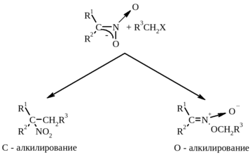 Алкилирование анионов нитроалканов под действием разнообразных алкилгалогенидов и бензилгалогенидов протекает по SN2-механизму с участием исключительно кислородного центра этих амбидентных анионов (O-алкилирование), например: