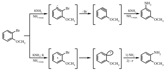 Как уже отмечалось выше, некоторые реакции, для которых характерен механизм отщепления – присоединения с образованием аринов в качестве интермедиата, в присутствии подходящего восстановителя изменяют механизм на SRN1, что отражается в изменении состава продуктов реакции. Так, например, при взаимодействии орто-броманизола с амидом калия в жидком аммиаке образуется 95% мета-анизидина (см. табл. 15.1), что определенно указывает на образование дегидроанизола в качестве промежуточного продукта. Та же самая реакция в присутствии металлического калия как инициатора цепного ион-радикального процесса приводит к орто-анизидину в качестве единственного продукта реакции: