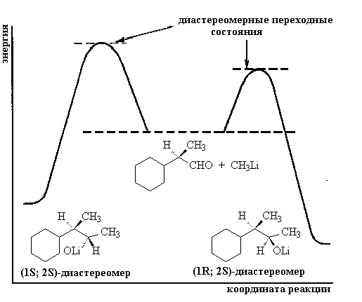 Рис. 16.2. Энергетическая диаграмма для образования двух диастереомеров при присоединении метиллития к хиральному альдегиду