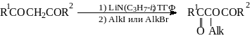 Для уменьшения тенденции к образованию диалкилпроизводных целесообразно алкилировать литиевые еноляты в апротонных малополярных растворителях (ТГФ, ДМЭ) при возможно более низкой температуре. Первичные алкилбромиды и, особенно, алкилхлориды дают значительно меньшее количество продуктов С,С-диалкилирования по сравнению с алкилиодидами. Вторичные алкилгалогениды по чисто стерическим причинам вообще не образуют продуктов С,С-диалкилирования.