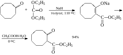Реакция протекает с хорошим выходом 70-80% только в том случае, если в результате циклизации образуются пяти или шестичленные циклы, т.е. при n = 4 и n = 5. Однако циклизация имеет место и при образовании макроциклов при n больше 12 при использовании техники высокого разбавления и гидрида натрия в качестве основания. В частности циклические 1,3-кетоэфиры С14-С16 получаются с помощью конденсации Дикмана с выходами порядка 30%. Этот метод совершенно неудовлетворителен для получения соединений с восьми-двенадцатичленным размером цикла.