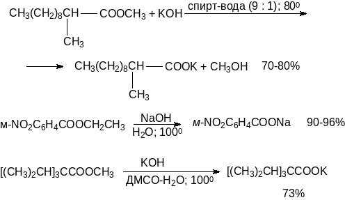 Последний способ предпочтителен для омыления сложных эфиров пространственно-затрудненных кислот, другой модификацией этого метода является щелочной гидролиз пространственно-затрудненных сложных эфиров в присутствии 18-краун-6-полиэфира:
