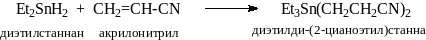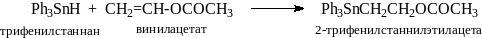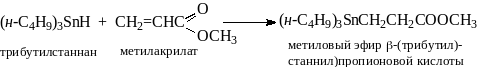 Для синтеза соединений олова, содержащих функциональные органические группы, в частности, ненасыщенные полярные группы (>С=О, -СºN) или группы с активным (кислым) водородом (-OH, -SH, -NH2) указанный выше метод применять неудобно, т.к. магний-, литий- или алюминийорганические соединения реагируют с такими группами. Одним из методов, используемых для получения таких соединений, состоит в присоединении органических гидридов олова к функционально замещенным алкенам или алкинам. Эта реакция носит название гидростаннилирование.