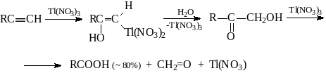 При реакции солей Тl (III) с алкинами в воде вместо гидратации тройной связи, идущей в случае солей Нg (II), происходит окисление: