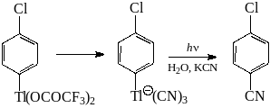 Интерес представляют также фотохимические синтезы на основе моноарилталлиевых солей. Например, фотолиз бис-трифторацетата 2-бром-4-метилфенилталлия в бензоле начинается с гомолиза связи C-Tl, после чего образующийся арильный радикал взаимодействует с бензолом. Эта реакция региоспецифична (т.е. региоселективна на 100%).