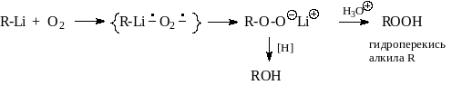 Первичным продуктом реакции с кислородом являются литиевые соли гидроперекисей, которые можно восстановить до спиртов без выделения из реакционной среды действием сульфита натрия или триалкилфосфата.