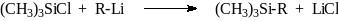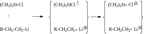 Выходы в этой реакции часто достигают почти 100%. Реакция замещения хлорида на карбанион может идти по механизму переноса электрона от литийорганического соединения к триметилхлорсилану, в результате которого образуется радикал R' и анион-радикал триметилхлорсилана; последний быстро распадается до аниона хлора и триметилсилильного радикала, который может соединяться с алкильным радикалом, образуя продукт, идентичный продукту прямого нуклеофильного замещения у атома кремния. Помимо этого образуются продукты димеризации и диспропорционирования алкильного и триметилсилильного радикалов.