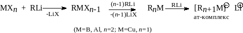 При взаимодействии литийорганических соединений с солями менее электроположительных, чем литий, металлов образуются новые металлоорганические соединения. В присутствии избытка RLi в результате такой реакции образуются так называемые "aт-комплексы", в которых число алкильных групп, связанных с металлом, на единицу больше валентности металла: