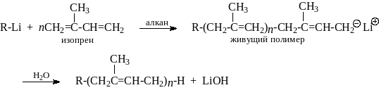 Сопряженные диены и стирол под влиянием литийорганических инициаторов полимеризуются. Такая анионная полимеризация нашла применение в промышленности. Образующийся полимер называется живущим полимером, т.к. на конце его цепи находится реакционный центр, способный к дальнейшему присоединению мономера. При достижении нужной степени полимеризации живущий полимер "убивают" обработкой водой.