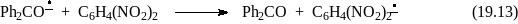 Несмотря на эти побочные процессы, неожиданное влияние микропримесей и ряд других специфических трудностей, в настоящее время все же удалось выяснить некоторые детали механизма реакции магнийорганических соединений с карбонильной группой. Подробно изучалась, например, реакция бензофенона с неопентилмагнийбромидом. В этой реакции образуются с 20%-ными выходами бензопинакон и неопентан, а в ходе процесса по спектру ЭПР удается наблюдать в растворе кетильный радикал бензофенонмагнийбромид, что указывает на радикальный SET-механизм (уравнение 19.12; R = (СН3)3ССН2, R’ = C6H5). Добавки в реакционную смесь пара-динитробензола полностью подавляют образование пинаконов (это установлено для реакций, в которых R = CH3 или трет-С4Н9), что можно объяснить исчезновением кетильного анион-радикала по реакции: