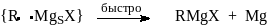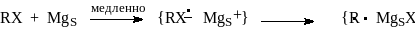 Механизм внедрения металлического магния по связи углерод-галоген, вероятно, включает стадию переноса электрона от магния к алкилгалогениду. Реакция происходит на поверхности металла (индекс "s"):
