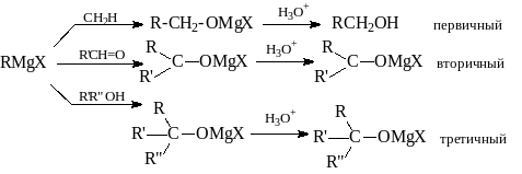 Присоединение к альдегидам и кетонам. Эта реакция очень хорошо известна как метод синтеза спиртов. Она обратима, особенно в случае пространственно затрудненных субстратов. Из формальдегида образуются первичные спирты, из других альдегидов - вторичные спирты, а из кетонов третичные спирты.