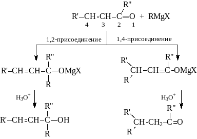 Если двойная связь активирована карбонильной группой (в -ненасыщенных карбонильных соединениях), то может произойти 1,2- или 1,4-присоединение: