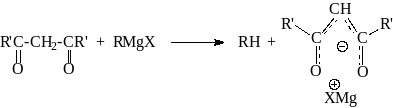 -Mеталлирование (енолизация) характерна для карбонильных соединений, имеющих достаточно кислые -водородные атомы. Для 1,3-дикетонов наблюдается только -металлирование: