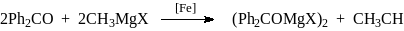 Восстановление до спирта наблюдается в том случае, если реактив Гриньяра содержит -водородный атом. Принято считать, что эта реакция идет через шестицентровое переходное состояние.