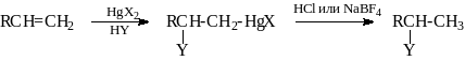 Если необходимо присоединить к олефину молекулу НY по правилу Марковникова, то удобным методом является проведение сначала сольвомеркурирования, а затем демеркуриpования. Стадия сольвомеркурирования описана в предыдущем разделе. Для удаления ртути наиболее часто используются протолиз или восстановление гидридами металлов.