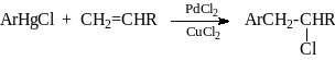Соли палладия катализируют также взаимо действие ртутьорганических соединений с алкенами, приводящее к продукту замещения, а в присутствии CuCl2 к продукту присоединения:
