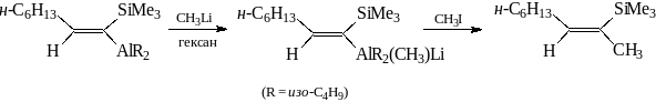 Алкенильные соединения алюминия реагируют с органическими галогенидами, как правило, очень медленно. Реакцию можно ускорить, превратив алкенильное алюминийорганическое соединение в "aт-комплекс" путем добавления алкиллития, например: