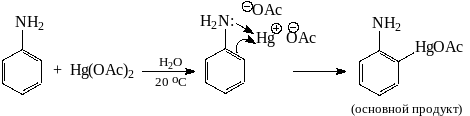Однако реакция обратима, и поэтому состав продуктов определяется термодинамическим контролем. Так, продолжительное нагревание толуола с ацетатом ртути в жестких условиях ведет к почти статистическому распределению продуктов (~40% орто-, ~40% мета- и ~20% пара-изомеров). На ориентацию могут оказывать влияние заместители, способные к координации с катионом ртути: