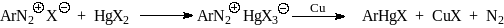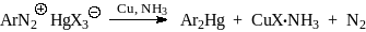 Если прямое меркурирование ароматических соединений не приводит к желаемому изомеру или дает смесь изомеров, то для синтеза арильных соединений ртути используют катализируемое медью разложение комплексов НgX2 с солями диазония. Эта реакция получила название диазометода А.Н.Несмеянова.