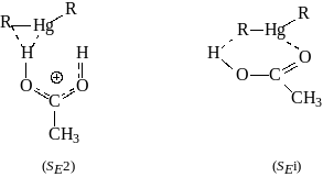 Хотя теоретически SEi-механизм более вероятен для несимметричных солей RHgX, в определенных случаях получены доказательства такого механизма и для ртутьдиалкилов. Так, при ацетолизе RHg (R = н-Bu, втор-Bu, камфил, неофил [PhCMeCH2]) в .уксусной кислоте обнаружено, что добавки ацетата натрия не влияют на скорость, тогда как добавки HClO4 ускоряют ее в 100 раз, причем реакция имеет первый частный кинетический порядок как по R2Hg, так и по НСlO4. Для "кислого" ацетолиза (в присутствии HClO4) в реакции участвует ион CH3COOH2+, и она имеет открытый SE2 -механизм. В отсутствие НСlO4 электрофилом является не катион CH3COOH2+, который мог бы образоваться в результате автопротолиза уксусной кислоты, а сама молeкула уксусной кислоты (иначе скорость бы замедлялась при добавлении CH3COONa, чего не наблюдалось), и реакция имеет механизм SEi, но не четырех-, a шестицентровый: