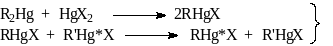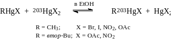 Все эти реакции очень легко осуществляются в растворах ртутьорганических соединений. Первая и третья из приведенных реакций вырождены (т.е. продукты имеют ту же структуру, что и реагенты), поэтому обнаружить их можно только при использовании радиоактивной ртути 203Hg.