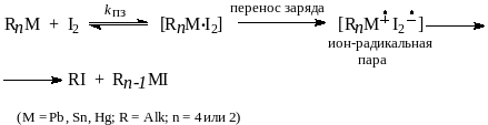 Предполагается, что в реакциях с галогенами, особенно в таких малополярных растворителях, как хлорбензол, первоначально образуется молекулярный комплекс галогена с металлоорганическим соединением, например, R4Sn.Br2. Молекула металлоорганического соединения, с одной стороны, выступает как кислота Льюиса, координируясь с неподеленной парой галогена; с другой стороны, возможно образование комплекса с переносом заряда путем обратного переноса заряда со связи углерод-металл к молекуле галогена. Такой перенос заряда обнаружен при изучении электронных спектров свинец-, олово- и ртутьорганических соединений в растворах иода в CCl4, при этом энергия полосы переноса заряда в спектрах уменьшается с уменьшением потенциала ионизации металлоорганического соединения, и одновременно возрастает скорость иододеметаллирования.