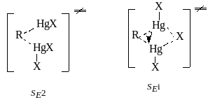 Стереохимическое изучение, проведенное на примерe оптически активного втор-ВuHgOAc, показало, что изотопный обмен ртути происходит с полным сохранением конфигурации втор-бутильной группы. Следовательно, можно полагать, что реакция идет по механизму SЕ2 или SEi через следующие переходные состояния: