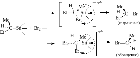 Изменение стереохимического результата реакции от предпочтительного сохранения до предпочтительной инверсии с увеличением размеров SnR3 - группы объясняется параллельным осуществлением двух путей реакции через переходные состояния, приведенные ниже.