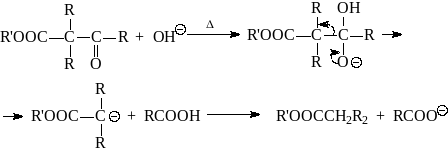 Вторая группа реакций анионного расщепления носит название ацильного расщепления, так как уходящая группа отщепляется в виде карбоновой кислоты (иногда в виде амида). Исходным субстратом является карбонильное соединение, которое атакуется ионом ОН- (или NH2-) с образованием интермедиата, расщепляющегося до карбоновой кислоты или амида по механизму SE1