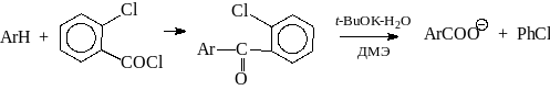 Расщепление неенолизируемых кетонов под действием оснований идет значительно труднее, чем расщепление -дикетонов или тригалогенметилкетонов, поскольку в этом случае отщепляющийся карбанион менее устойчив. Однако при действии смеси t-BuOK-H2O (10:3) в эфире, ДМСО или ДМЭ или при действии твердого t-BuOK без растворителя такие соединения все же удается расщепить. С помощью этой реакции можно ввести карбоксильную группа в ароматическое кольцо: