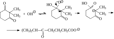 Расщепление можно проводить ионом EtO-, тогда вместо солей образуются этиловые эфиры карбоновых кислот. Такая реакция обратна конденсации Кляйзена (гл. 17). При расщеплении циклических дикетонов образуются соли кетокислот, например: